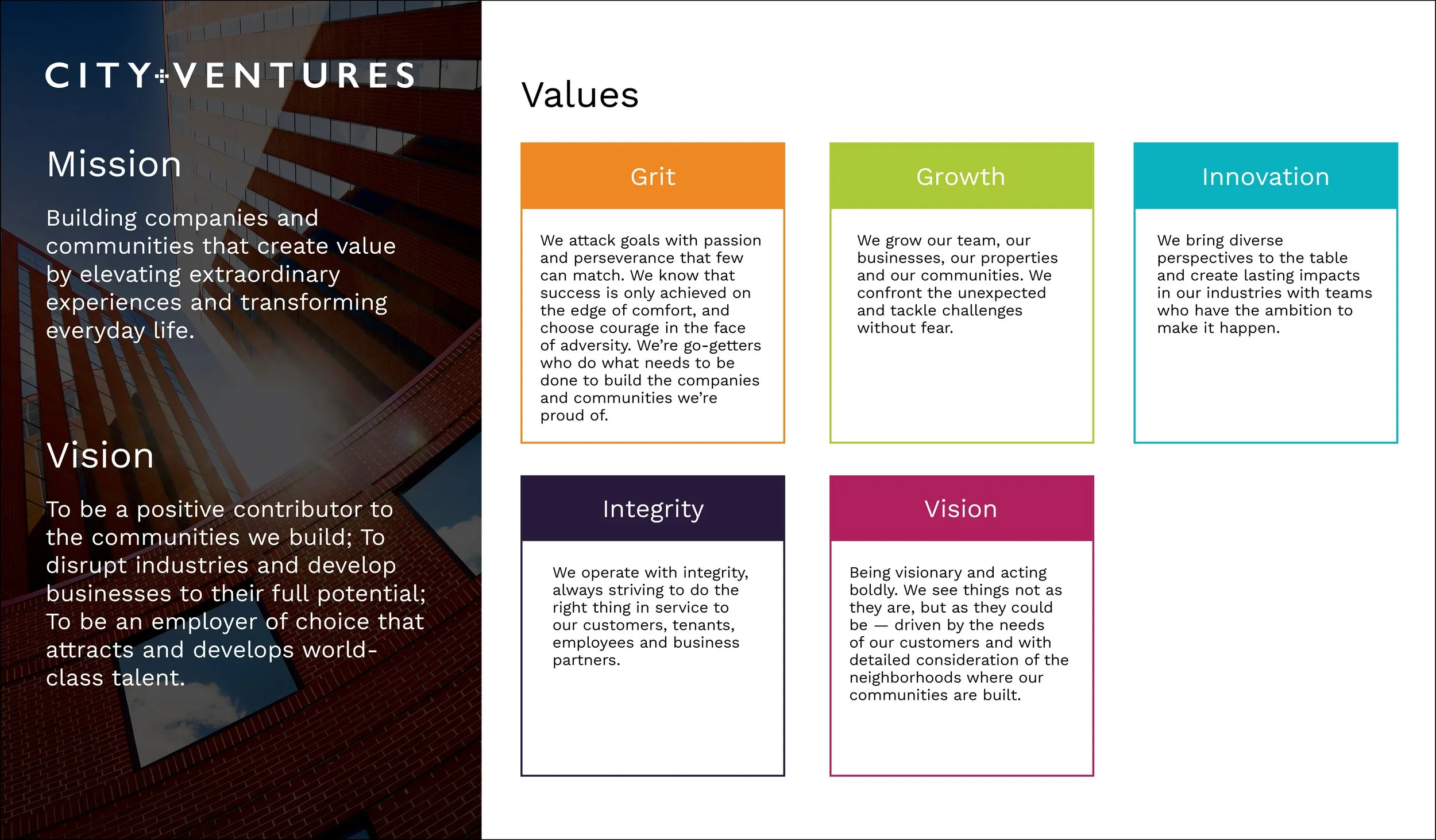 The Mission, Vision, and Values of a company establish their foundational purpose, establish long-term aspirations for their future, and display their culture and ethics to employees and the public. Although City+Ventures has been around for ten years, their portfolio of companies have always been the forefront of their focus compared to their corporate identity. It was time to establish a core brand foundation to represent the roots of the parent company.